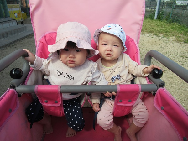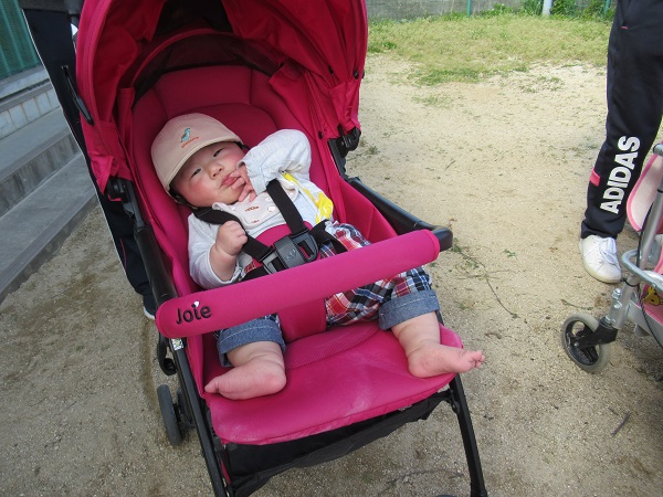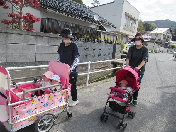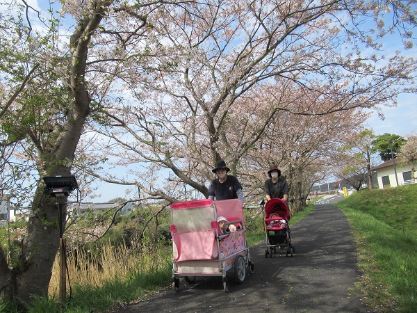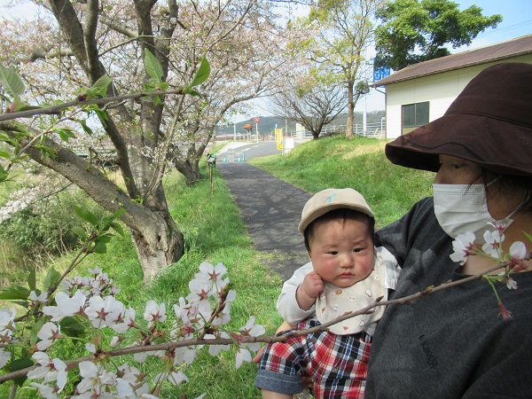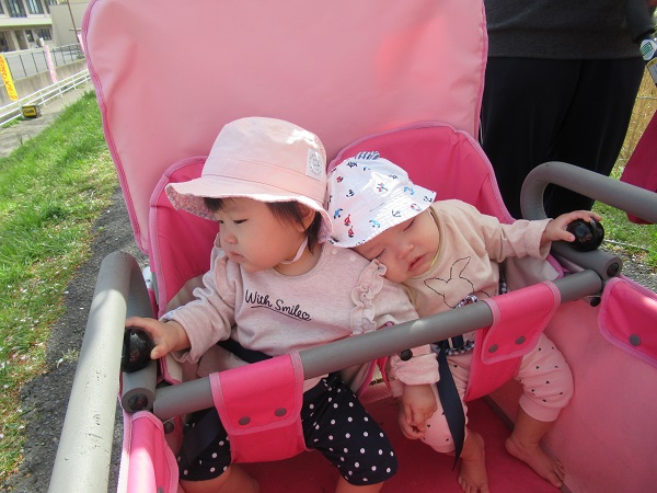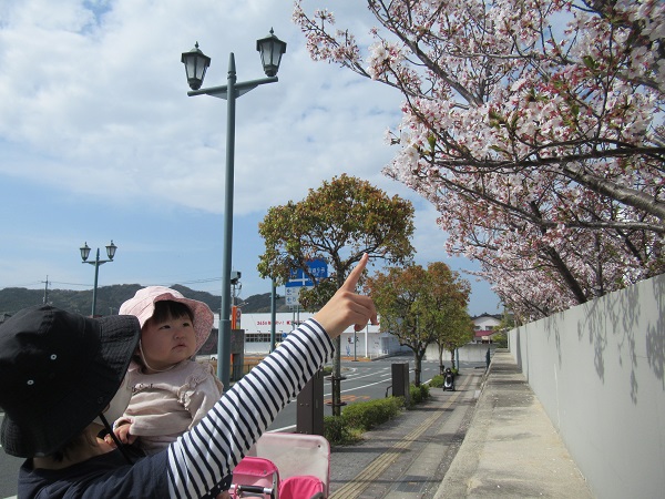 2021年04月02日 初めてのお散歩!桜の花を見に、散歩に出かけました!行ってきまーす☆散歩車に揺られて眠くなったお友だちも...。LEEさんの前の桜を見たり...警察署裏の桜並木を通って、近くで桜を見ましたよ。キレイだったね♪