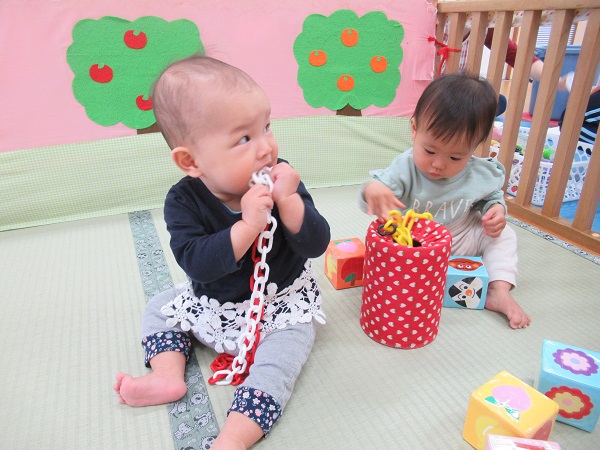 積み木やボール、ガラガラなどを用意して好きな遊びを楽しみましたよ。