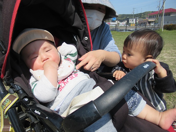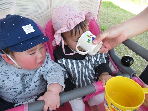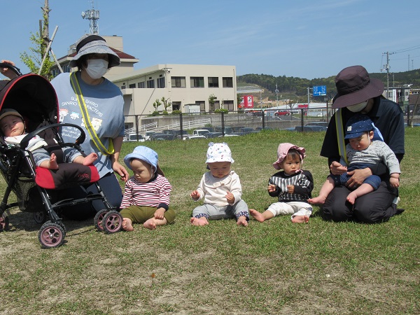 2021年04月21日 いい天気♪今日はとってもいいお天気だったので消防署横の広場へお散歩に行きました。到着するとまずは水分補給です。散歩車から降りるとそれぞれ気になった所で遊びましたよ。お友だちの顔を見て交流を深めてみたり・・・草を持って遊んでみたり・・・ハイハイであちこちを探索したりと、それぞれの楽しみ方で広場を満喫したいちご組さんでした。また遊びに行こうね☆