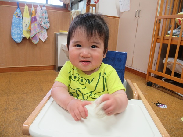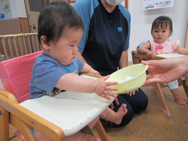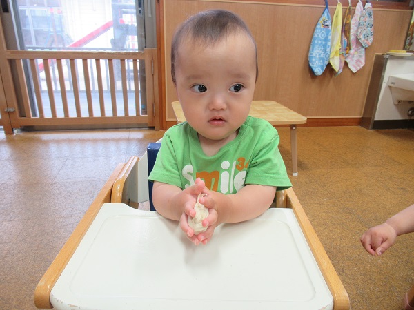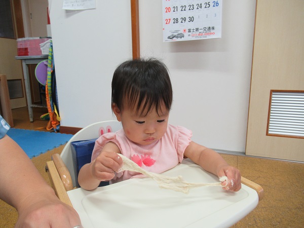 2021年06月04日 小麦粉粘土☆小麦粉粘土をしました☆小麦粉を見せると、「これはなに?」という表情で見ていました■ぎゅっと握ってみたりびよーんと伸ばしてみたり楽しくてバタバタと大興奮!伸ばす・つまむ・つかむ・ひねるなど、指先を使って色々な動きや感触を楽しむ粘土あそびは、脳の発達を促すのにとても良いとされていますよ。小麦粉と水があれば出来ますので、お家でも一緒にやってみてくださいね☆