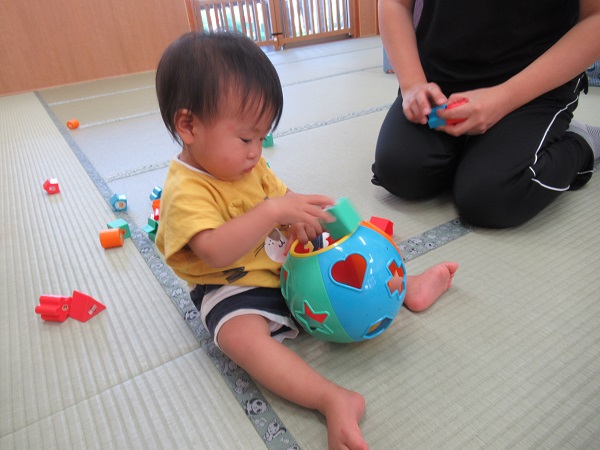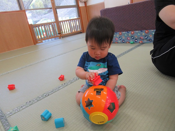 型はめブロックは指先を使って出来る遊びの一つです。指先を使うことで脳の活性化につながり、思考力・集中力を身につけることが出来るそうですよ。