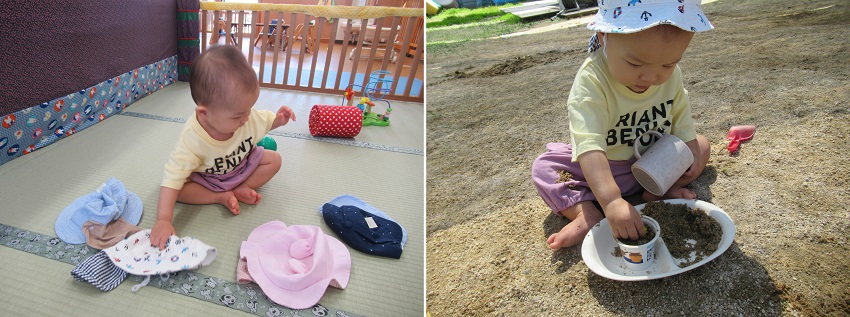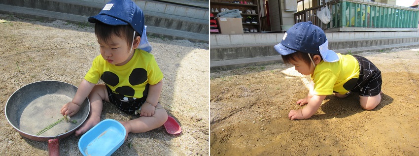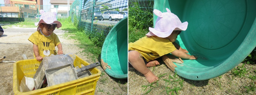 どれにしようかな?と遊ぶものを選んだり、タライの水を見つけてパシャパシャ■