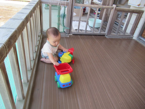 こちらはテラスで大好きな車を走らせて遊びました!