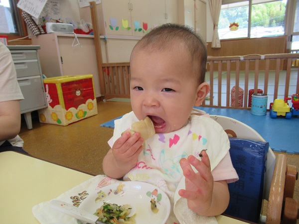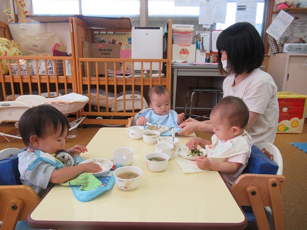 完了食のお友だちはベビーチェアから、普通の机にかわり、みんなで一緒に食べましたよ。
