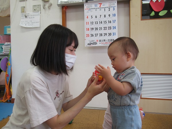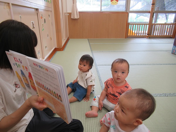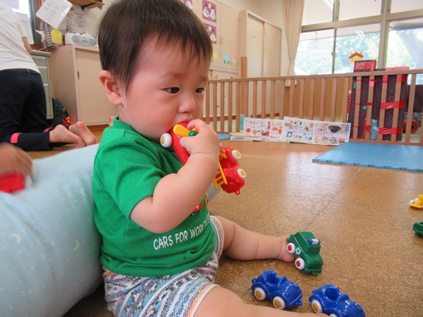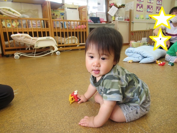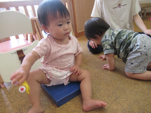 2021年07月07日 のんびり☆今日は雨が降っていたのでのんびりとお部屋で過ごしました。フローリングのひんやりとした感触を楽しみながら、おもちゃを出して遊びました。保育者に車のおもちゃを見せに来てくれたお友だち。お口でおもちゃの形を確かめるお友だちもいました保育者に本を読んでもらっている間も上手に座って見ることができました。