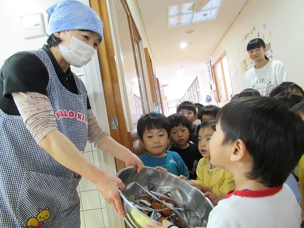待ちに待ったおやつの時間♡いつもの柿と食感が違うので苦手なお友だちもいましたが、「おいしーい!!」「あまーーい■」と手作りの干し柿をおかわりするお友だちもいましたよ✨