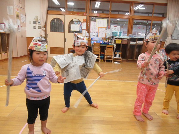 その後は、新聞紙を使って神楽ごっこをしましたよ