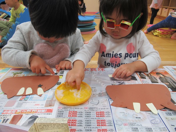 みかん組さんは、一足先に正月遊びの福笑いを楽しみました■■