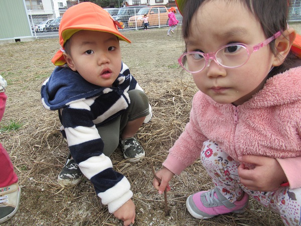 新園庭へ出ると、「虫いないかなぁ~」と土の中をツンツン!