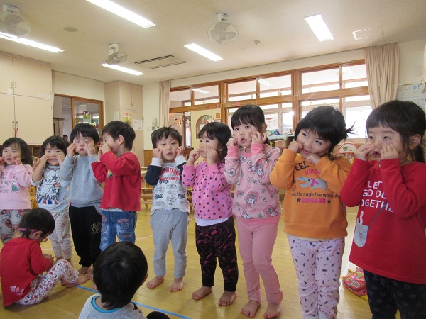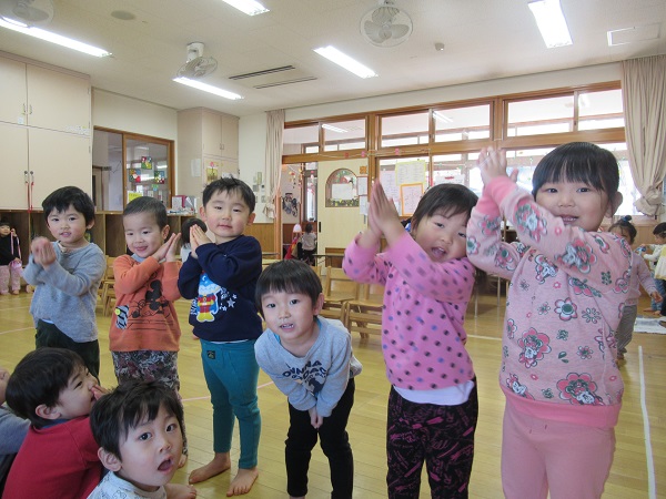お散歩から帰ったら、給食までの間、みかん組さんによる手遊びが始まりました☻