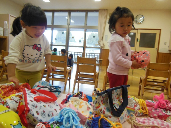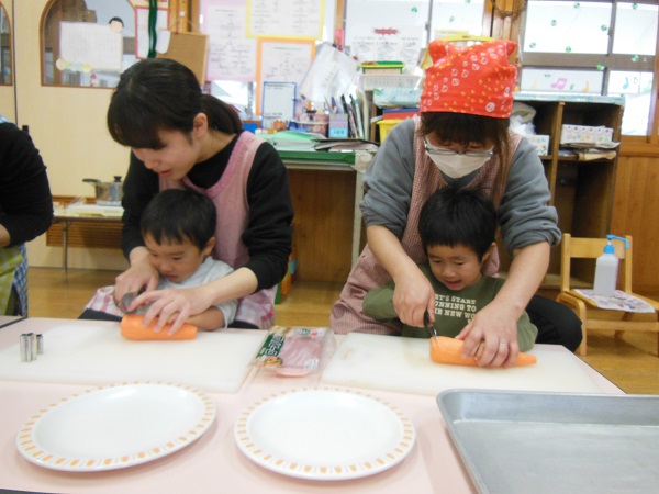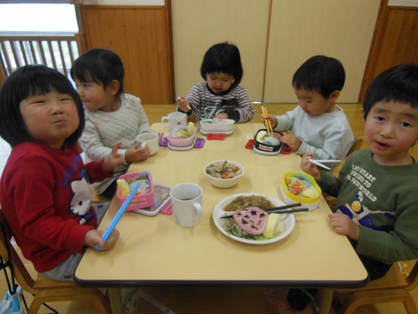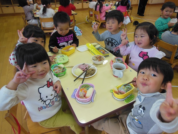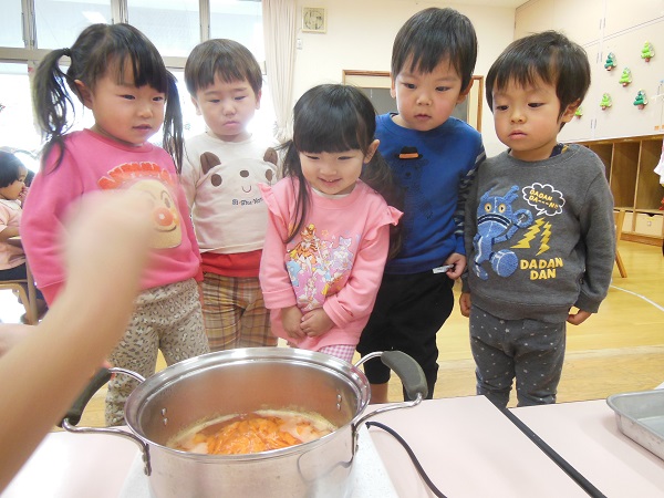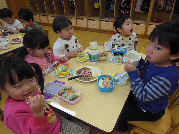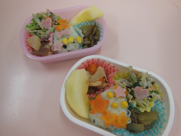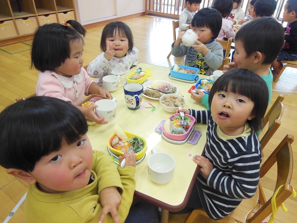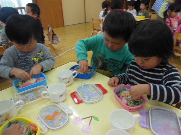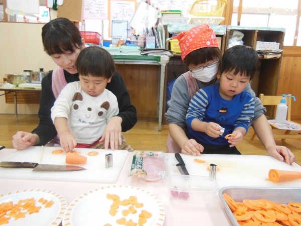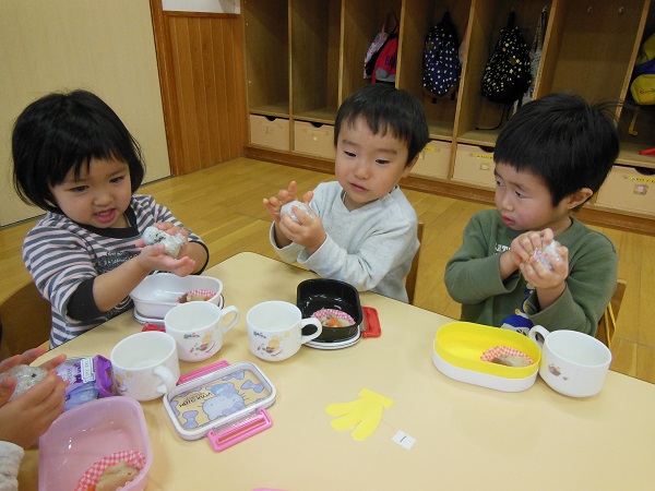 2017年12月08日 お弁当ごっこ!今日はみんな大好きお弁当ごっこの日です♪まずは人参を切って、星の形に型抜きをしました☆お星さまがぶくぶくと浮かんでくるのを興味津々で見ています!おにぎりを三角の形にぎゅっぎゅっと握って、型抜きした人参、ハム、チーズをクリスマスツリーおにぎりの上に飾り付け✨かわいいクリスマス弁当が完成しましたよ■■おにぎりと人参のおかわりをたくさんして、お腹も心もいっぱいのみかん組さんです■■