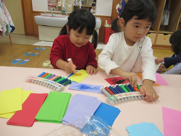 2019年11月15日 作品展に向けて・・・作品展に向けて秋の自然物を使った製作をしました。まずは可愛い洋服作り。3枚選びましたよ。3枚選ぶと模様を付けました■「どの帽子にしようかな~」最後はまつぼっくりとドングリの帽子を付けて完成です☆色々な顔の人形が出来上がりました。可愛いまつぼっくり人形の家族になる予定ですので、お楽しみに♪