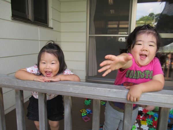 泥んこ遊びが出来ないお友だちはテラスでブロックを出して遊びましたよ。