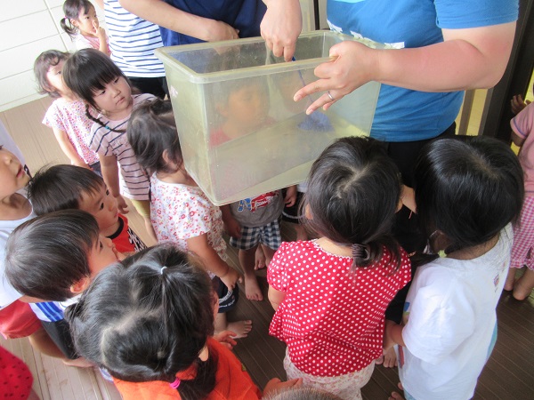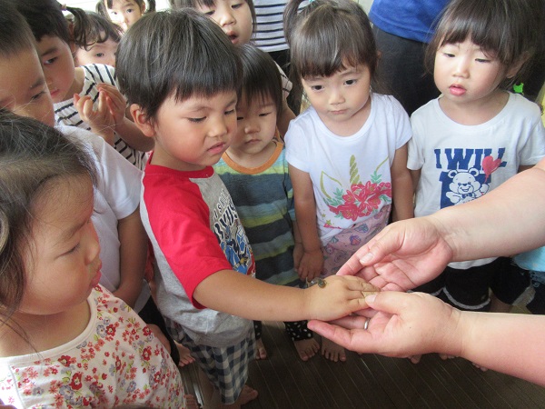 怖そうにしている子や手の平に乗せて欲しいと言ってくる子がいたりと反応は様々でした☆