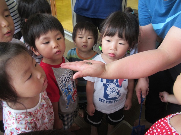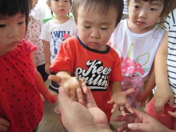 保育者の手の平に乗せると興味津々にのぞき込んでいました■