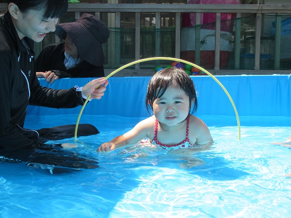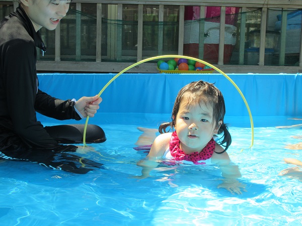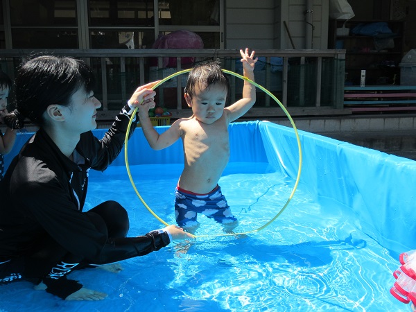 フープくぐりは、ワニ泳ぎやアヒルさん歩きなど好きなくぐり方で挑戦しましたよ。