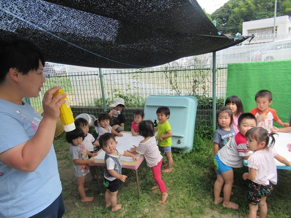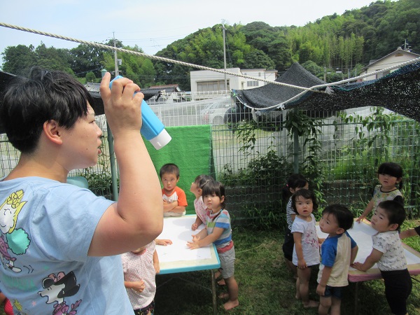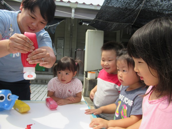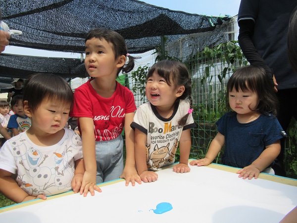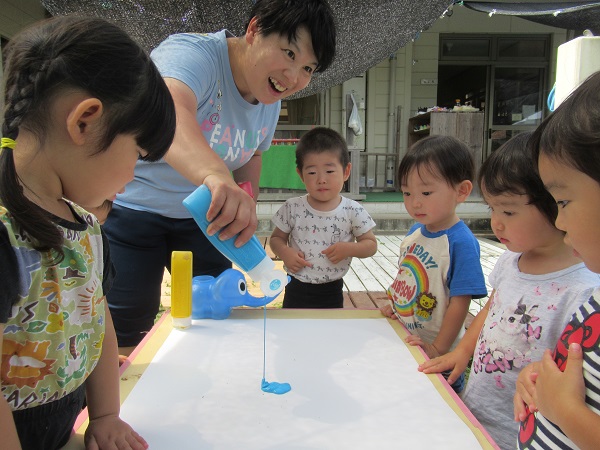 絵の具を大きな白い紙に垂らすと、「わあ~」と目がくぎづけです■
