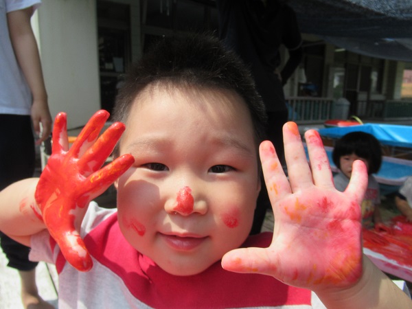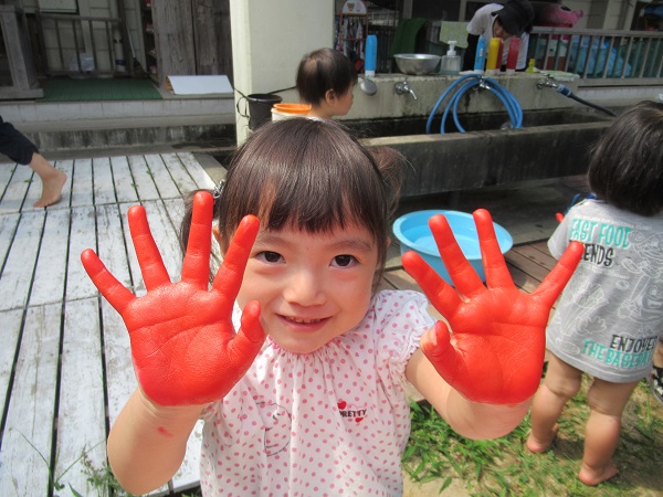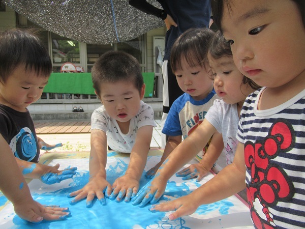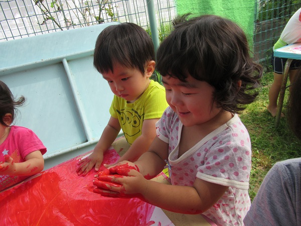 絵の具と少しの水を混ぜると、さっそく「ぬりぬり~」と、とても気持ち良さそうに触っていました☺