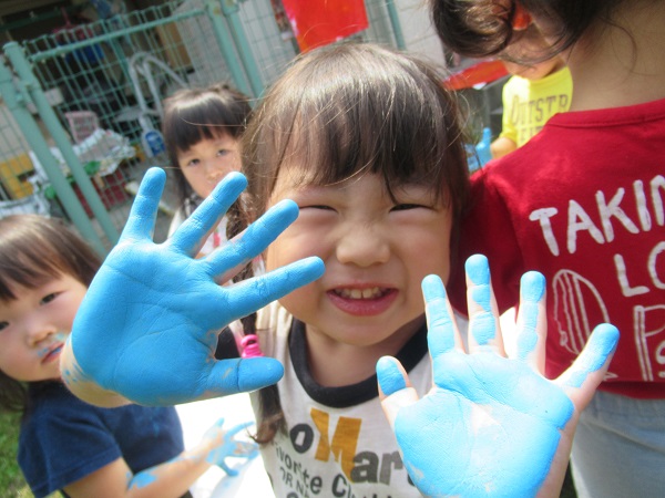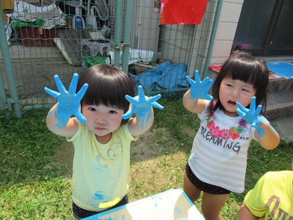 きれいな青空の下、りんご組さんと一緒に絵の具で遊びましたよ☀