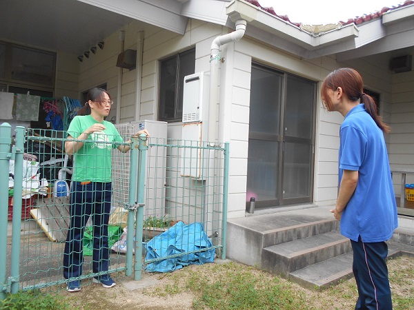園長先生が不審者役になり、発見者とみかん組の保育者が対応しました。