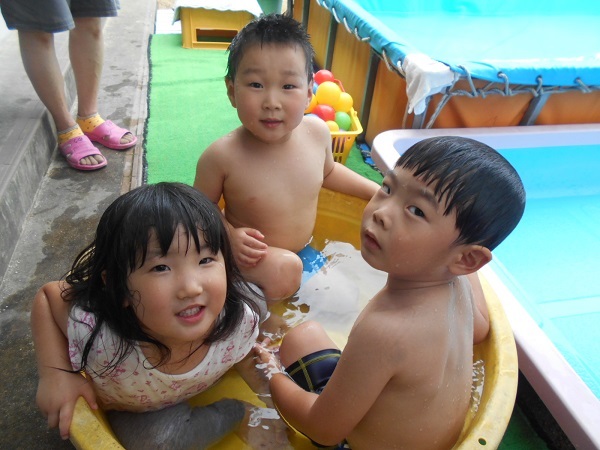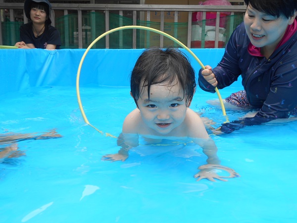 1歳児さんもプールに慣れて、大きなプールでもへっちゃらです☺
