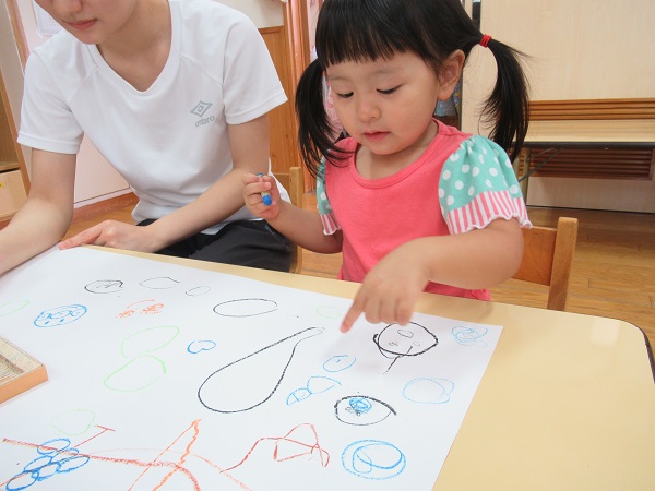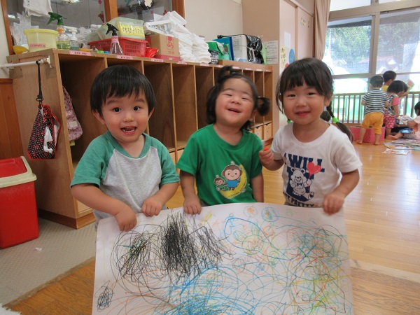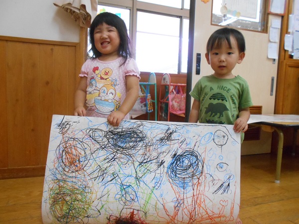 大きな白い紙が小さな画伯達の手で素敵な作品になりましたよ☺