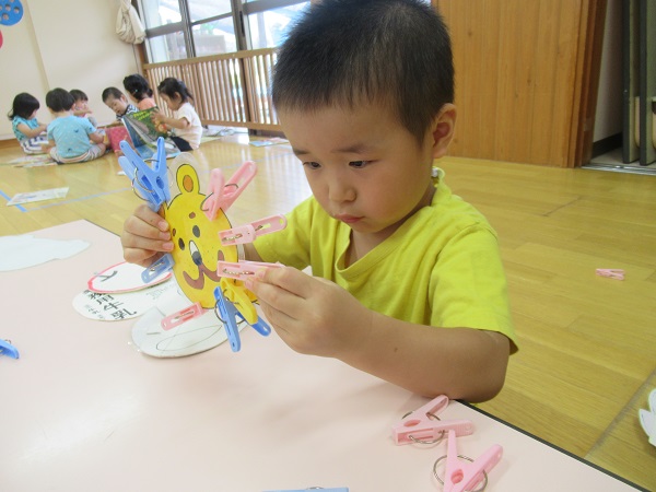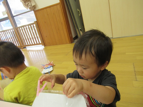 洗濯ばさみを広げるのは難しいですが、上手に出来ていましたよ☆