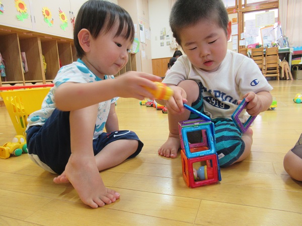 マグブロックでは、お友達と一緒にくっつけて遊んだりと、仲良く楽しみました♬