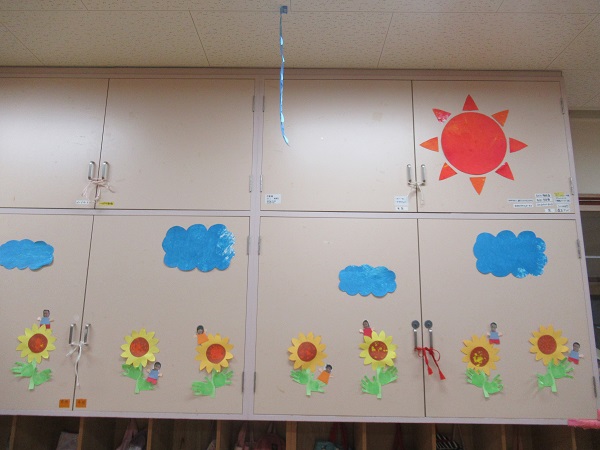 先日、フィンガーペインティングで色塗りをした作品が完成したので登降園の際に見てみてくださいね。