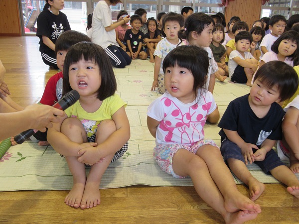 保育者にインタビューされると、たくさんの人の前で緊張してしまい固まってしまうお友だちも・・・