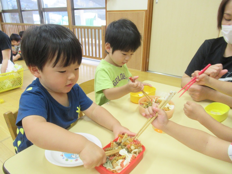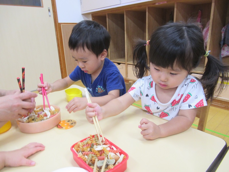 箸の練習ではマカロニを上手に挟んでお皿からお皿に移し替えることを頑張っていましたよ☆