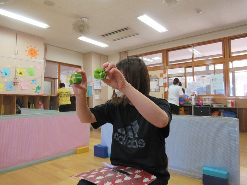 いざスタンプに挑戦!ピーマンとチンゲン菜とオクラの中から好きな物を選び、優しくポンポン押していきました♪