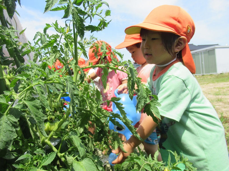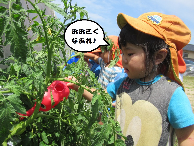 「パプリカさんトマトさん大きくなってね♡」と声を掛けながらお水をあげていましたよ♪