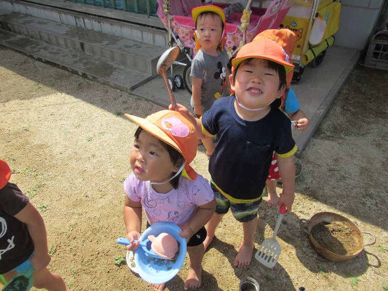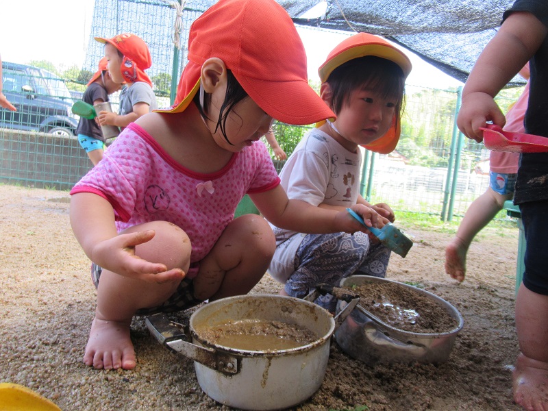 「今日も泥んこ遊びをします♪」と保育者が伝えると、子どもたちは大喜び✨