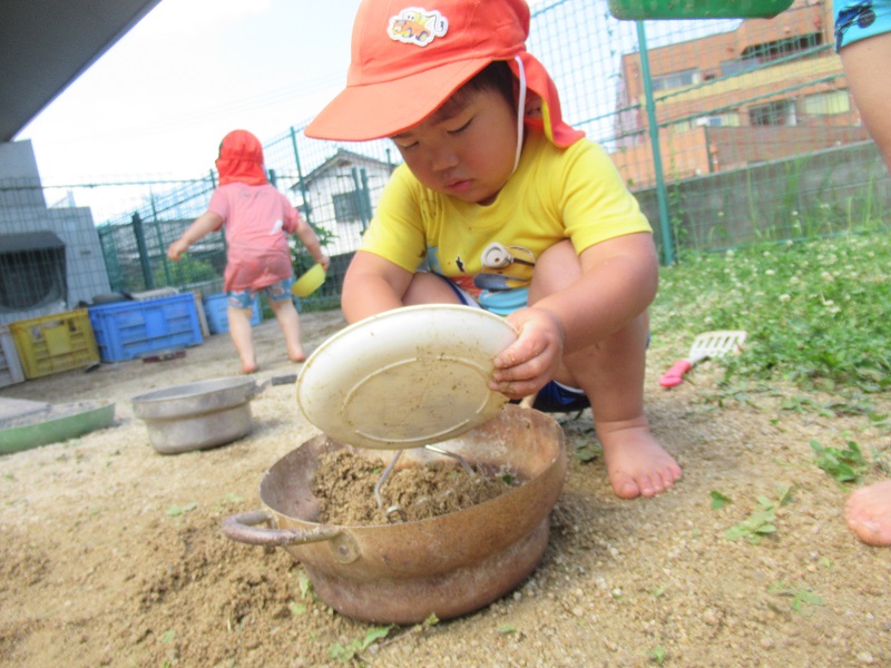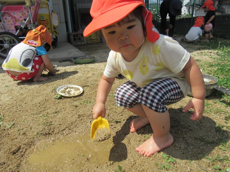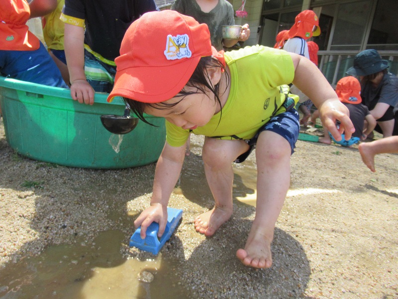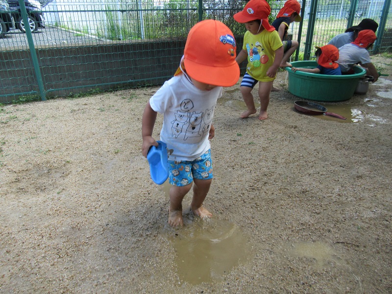 園庭の水たまりではいろいろな遊び方で楽しんでいました☺