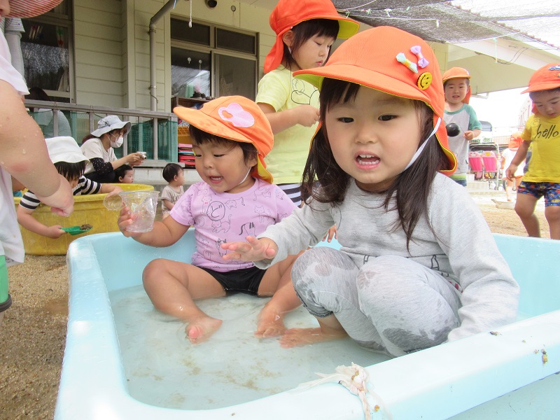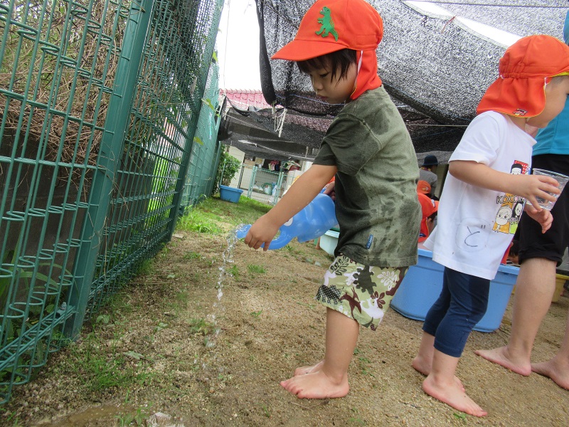 泥んこ遊びを楽しんでから、新園庭に野菜の様子を見に行きました■