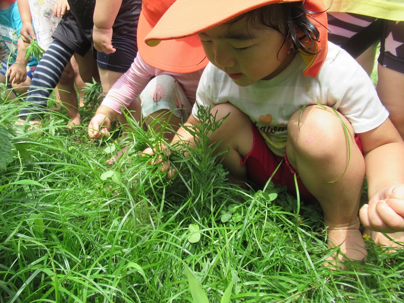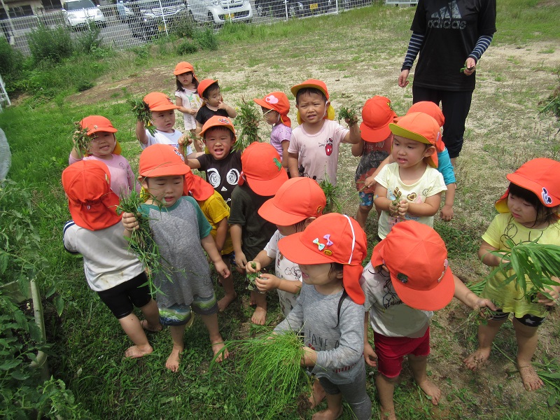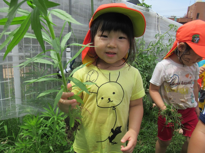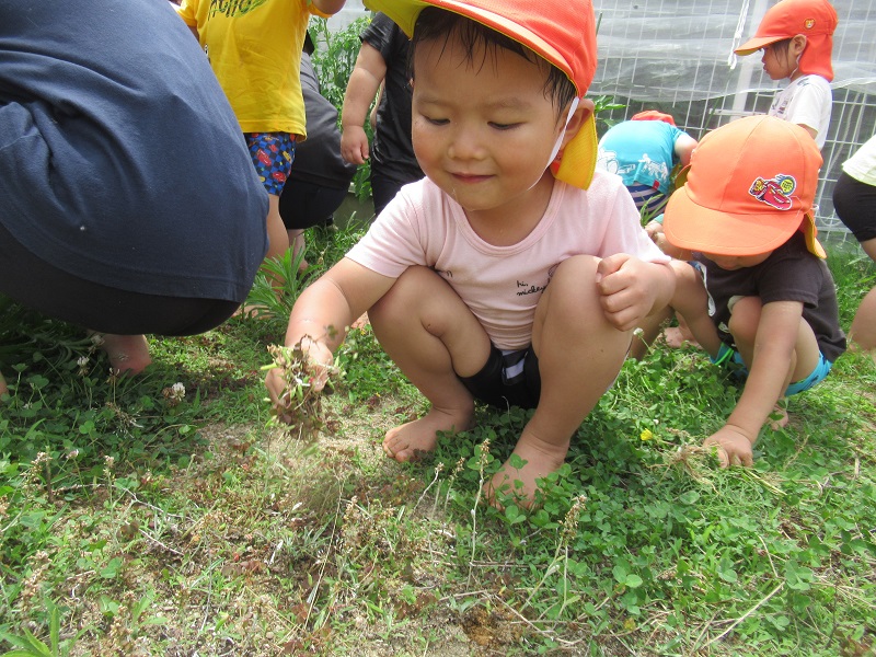 「草がたくさんあると、トマトさんとパプリカさんあつい?」と子ども達が言ったので草抜きをすることに。