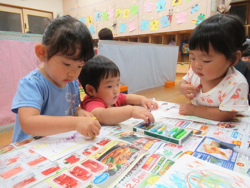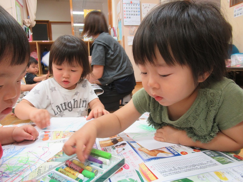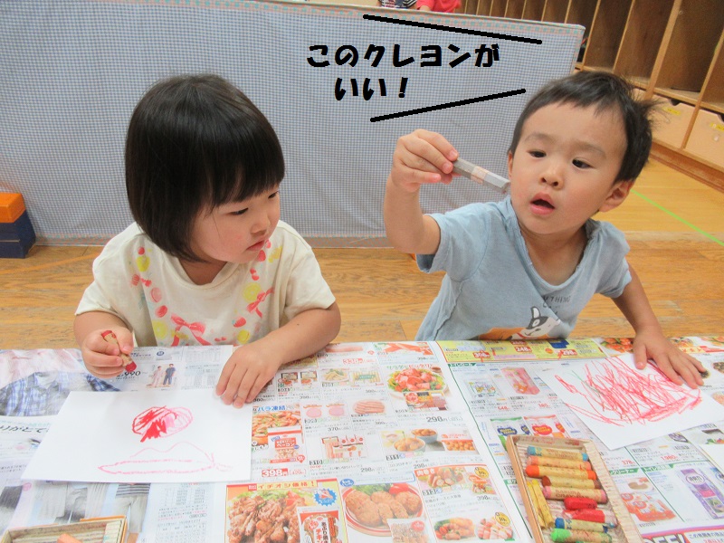 まず好きな色のクレヨンを選んで、白い画用紙に模様を描きました。