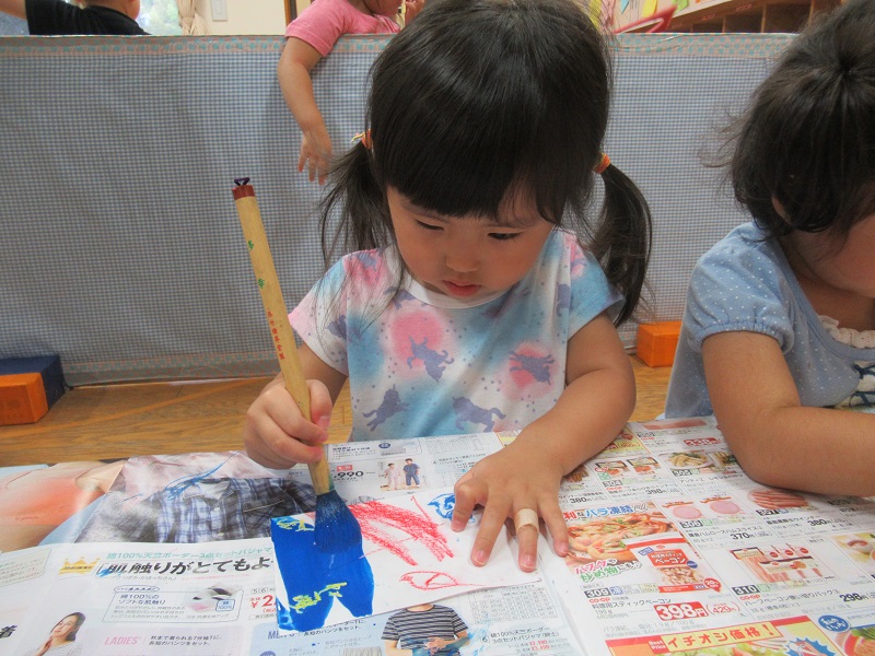 クレヨンで模様を描いた後は絵の具を塗りました。筆を持つ手に力が入ってしまったり、弱すぎたり...筆で塗るのはちょっと