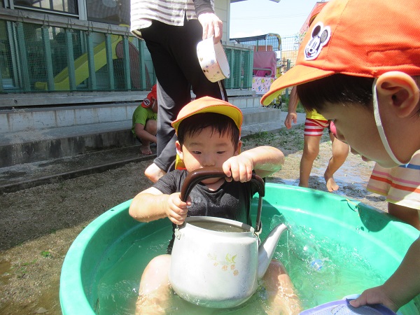冷たい水をペットボトルに入れ、「つめたいりんごジュースで~す♡」と保育者にご馳走をしてくれましたよ✨