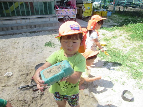 2021年07月01日 ぴゅー!今日もとってもいい天気!元気に水遊びをしましたよ☀水鉄砲が大人気!今まで「水遊びは苦手・・・」と言っていた子も「水鉄砲ならしたい!」と楽しむことができました。もちろん砂遊びも盛んです。「ダンゴムシだよ~」明日も水鉄砲できるかな?お部屋の中では車や絵本を出して遊びました。あっという間に7月に突入!たくさん水遊びができるといいですね■