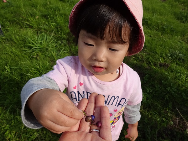 お花や野ぶどうを摘んで「みてみて―!」と笑顔いっぱいのりんご組さんです■