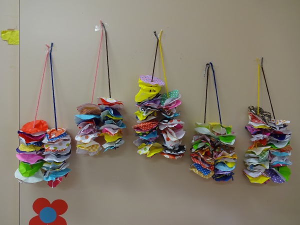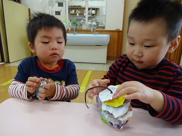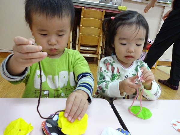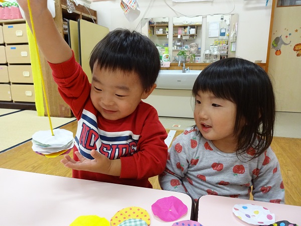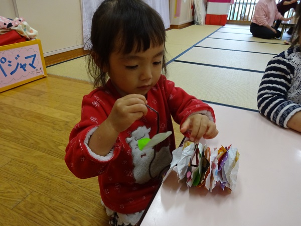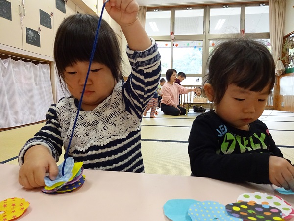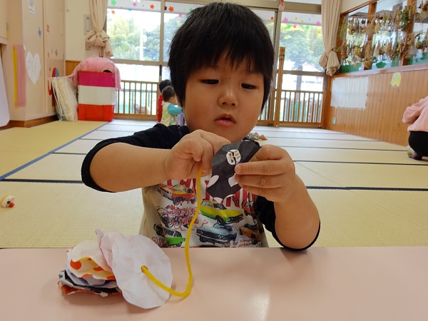 2018年11月13日 カラフルみの虫☆すっかり秋が深まりましたね。今日は、時々お散歩でも見かける「みの虫」を作りました。くしゅくしゅにした折り紙の真ん中には穴が開いていて、そこにヒモを通してつなげます。「みてーできたよー」こんなにカラフルでかわいいみの虫に...❤あとはお顔をつけたら完成です!
