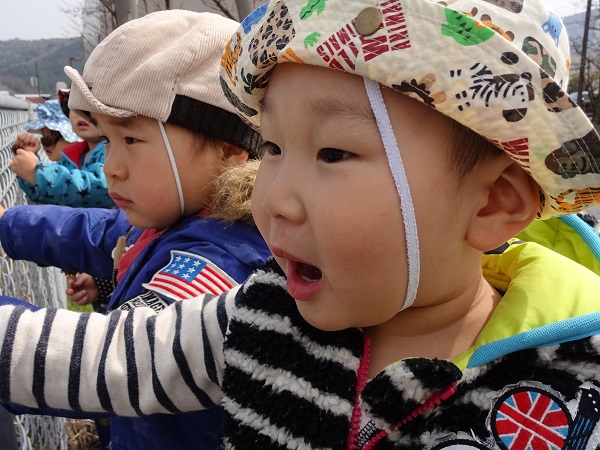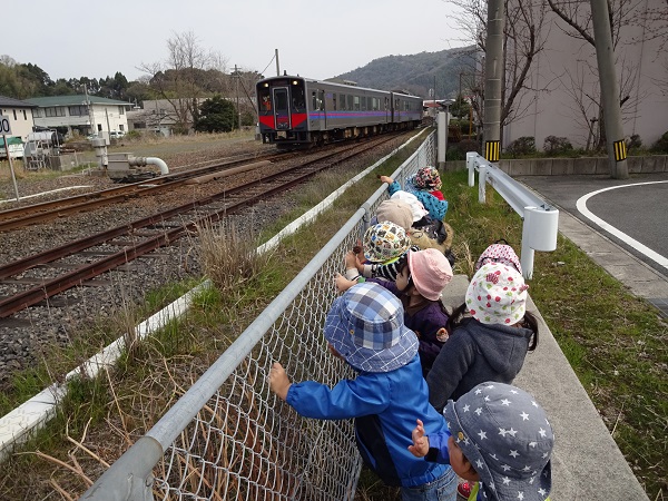 汽車が一番よく見える場所に移動し、汽車を待つりんご組さん■