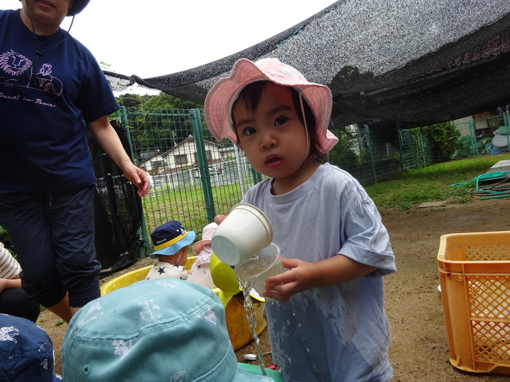 どろんこ遊び♪ 2023年09月11日 園庭に出ると、みかん組さんがピーマンの収穫をしていました。 収穫したばかりのピーマンを触らせてもらいましたよ♪ どんな匂いがするかな~? 遊び始めると、あさがおの色水作りに興味津々! 嬉しそうに見せてくれましたよ☆ 「きれーい♪」 水たまりに入ったり、カップで水をすくったり…♪ ジャーッと流すことも楽しい子どもたちです!! 天気と相談しながら、今週も泥んこ遊びを楽しめるといいなと思います!