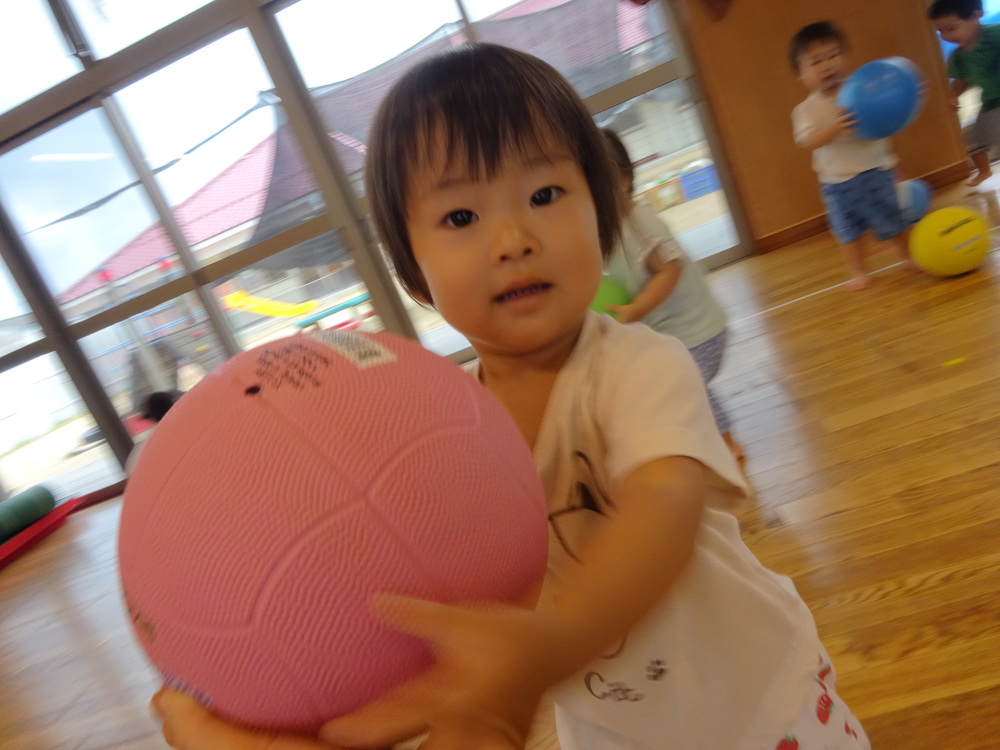 ボールで遊んだよ♪ 2023年09月28日 遊戯室でボール遊びをしました。 「先生、キャッチしてね~?」 走ってボールを追いかけたり・・・ 「先生、あっち~。」と指差しをして保育者に取って!とお願いしたり・・・(笑) 職場体験のお姉さんにお気に入りのボールを「はい!どうぞ♪」 「たくさん遊んで疲れたな~。」とボールをを枕にして休憩タイム☆ 体をたくさん動かしました。楽しかったね♪