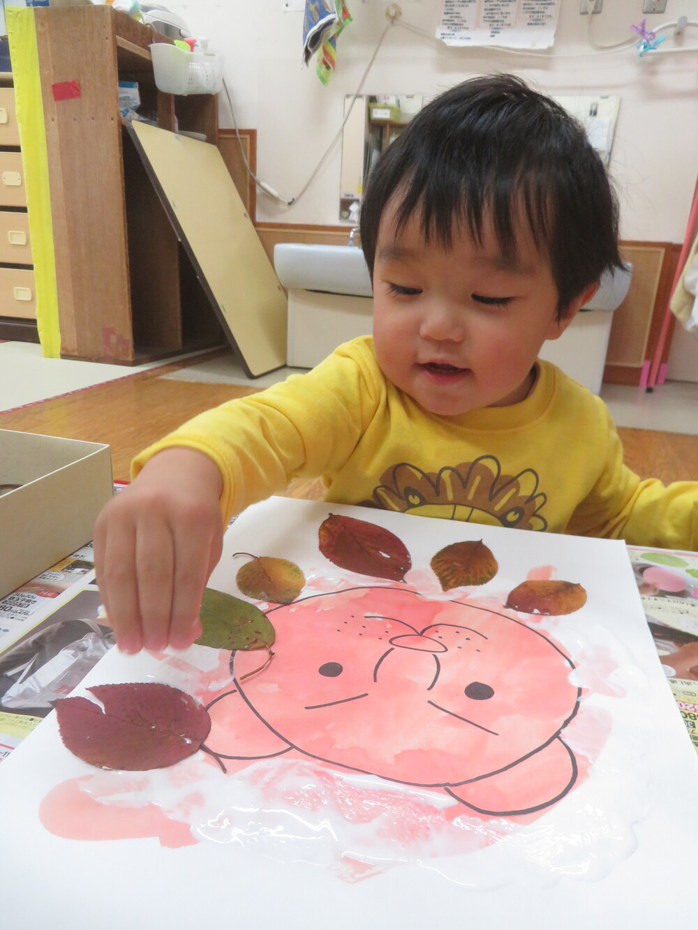 ライオン制作part2 昨日のライオン制作の続きをしました。 ライオンの顔の周りにボンドを塗り、その上に、お散歩先で拾った落ち葉をペタペタと貼っていきます。 赤、黄、緑、茶…いろんな色に、いろんな大きさ、いろんな形の葉っぱの中から「これ!!」とお気に入りの葉っぱを決めるりんご組さん☺ 上手に顔の周りに貼り、カラフルで元気いっぱいのライオンさんが完成しました!!