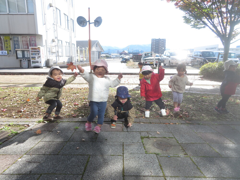 ポカポカ♪ 今日はポカポカ暖かくお散歩日和♪ あすてらす前の広場にお散歩に出かけました! かけっこをしたり、木陰でかくれんぼをしたり・・・ 落ちている葉っぱや小枝を手に取り「エイサー!!」と神楽公演も始まっていましたよ☺ 帰り道には、サンタクロースを見つけ、みんなで記念撮影もしました☆ 少しずつ季節が移り変わっていきますね・・・☆