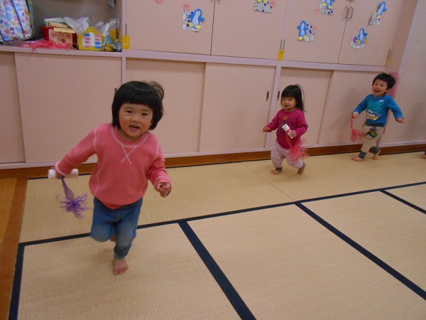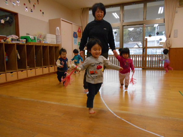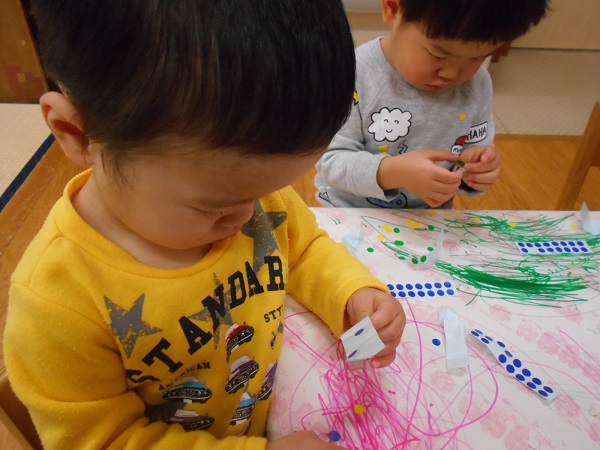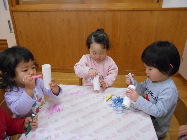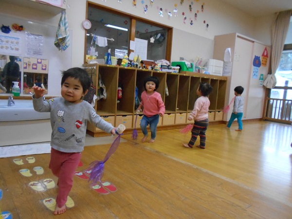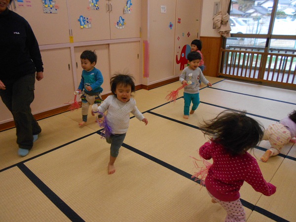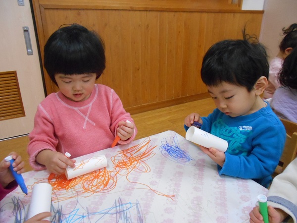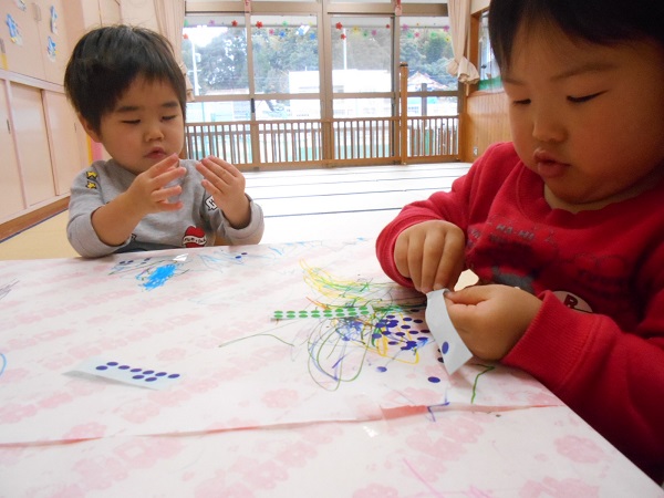 2018年01月12日 凧揚げ☆今日はみんなで凧揚げをしました!トイレットペーパーの芯に絵を描いたり、シール貼りをしたりして、りんご組さんオリジナルの凧ができましたよ♬指先が器用になり、小さなシールも簡単に貼ることができますよ✨完成をしたら、早速凧揚げの開始!!!凧を片手に持ち、気持ちいいほど走り回るりんご組さんでした■