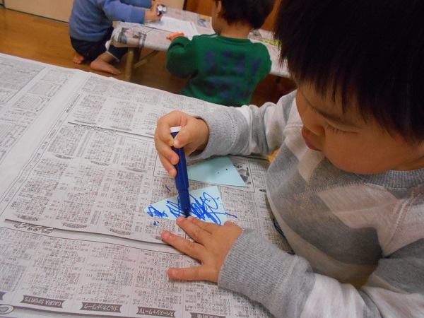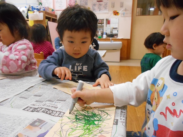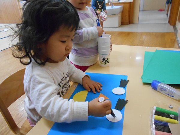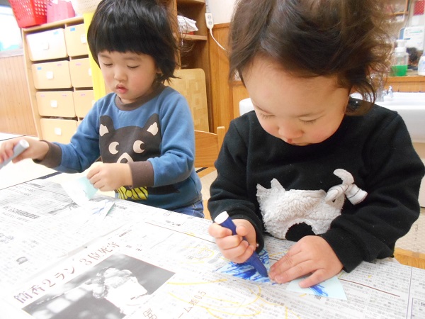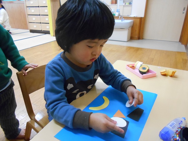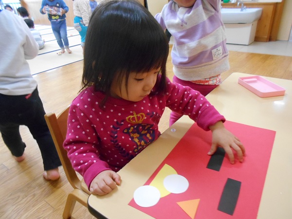 2018年01月19日 楽しい鬼のお面作り☆今日は節分会で使う鬼のお面を作りました♬マーカーペンで髪の毛と角になる部分をじろじろとお絵描きをします!カラフルに仕上がりましたよ■つぎは顔に挑戦!!!福笑いのように自分たちで顔のパーツを貼っていきます!「どこに貼ろうかな~???」と、とっても真剣に取り組むりんご組さんでした■どんな鬼さんになるのでしょうか・・・出来上がりを楽しみにしていてくださいね♬